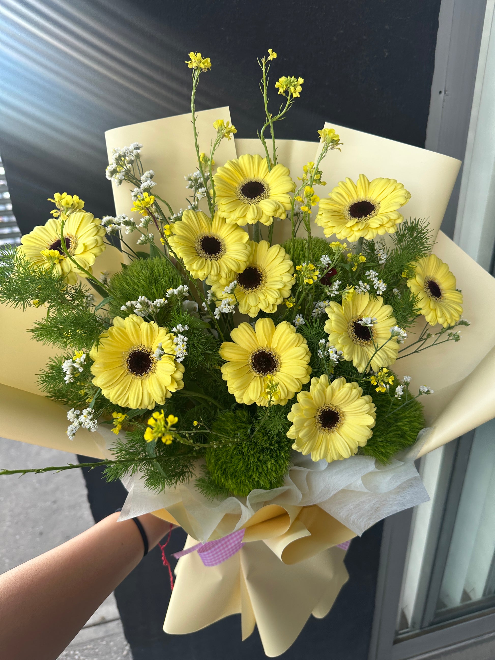 Las gerberas son flores que simbolizan felicidad, energía y optimismo. En su versión mini, aportan un aire delicado y juvenil, perfecto para expresar cariño y buenos deseos. Al integrarse con follaje de estilo garden, el ramo adquiere un aspecto más orgánico y relajado, evocando la belleza de la naturaleza en su estado más puro.